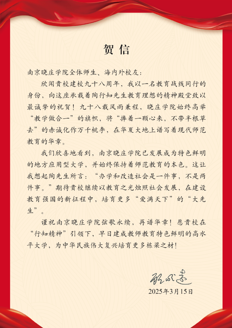 顾明远在贺信中说,九十八载风雨兼程,晓庄学院始终高举“教学做合一”的旗帜,将“捧着一颗心来,不带半根草去”的赤诚化作万千桃李,在华夏大地上谱写着现代师范教育的华章。