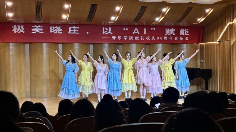 音乐学院以极美晓庄,以‘AI’赋能为主题举行音乐会。音乐学院师生以科技为笔、艺术为墨,将校史文脉与未来科技交织成一场跨越时空的视听盛宴,献礼母校华诞。音乐会以女声合唱《幸福阳光》拉开帷幕,清澈歌声如春风拂面。戏曲《华彩梨园》展现国粹魅力,青年学子以水袖翩跹致敬传统。当AI技术邂逅百年校史,原创歌曲《光年之外·晓庄之声》与《晓庄青春颂》惊艳亮相,数字音符与人文情怀碰撞出璀璨火花,演绎出新时代教育追梦人对星辰大海的深情凝望。红色基因在思政情景剧《假如我为了真理而牺牲》中焕发新生,师生通过数字技术实现与雨花英烈赵良璋的隔空对话,让烈士遗作《假如我为了真理而牺牲》穿越时空震撼回响。竹笛独奏《秦川抒怀》与豫剧《拷红》则用传统艺术编织文化自信的经纬。当全场师生共同唱响陶行知先生创作的《锄头舞歌》,铿锵旋律承载着教学做合一的校训精神,将晚会推向高潮。此次音乐会创新引入AI技术,既是对校庆主题的科技献礼,亦是对艺术教育改革的生动实践。