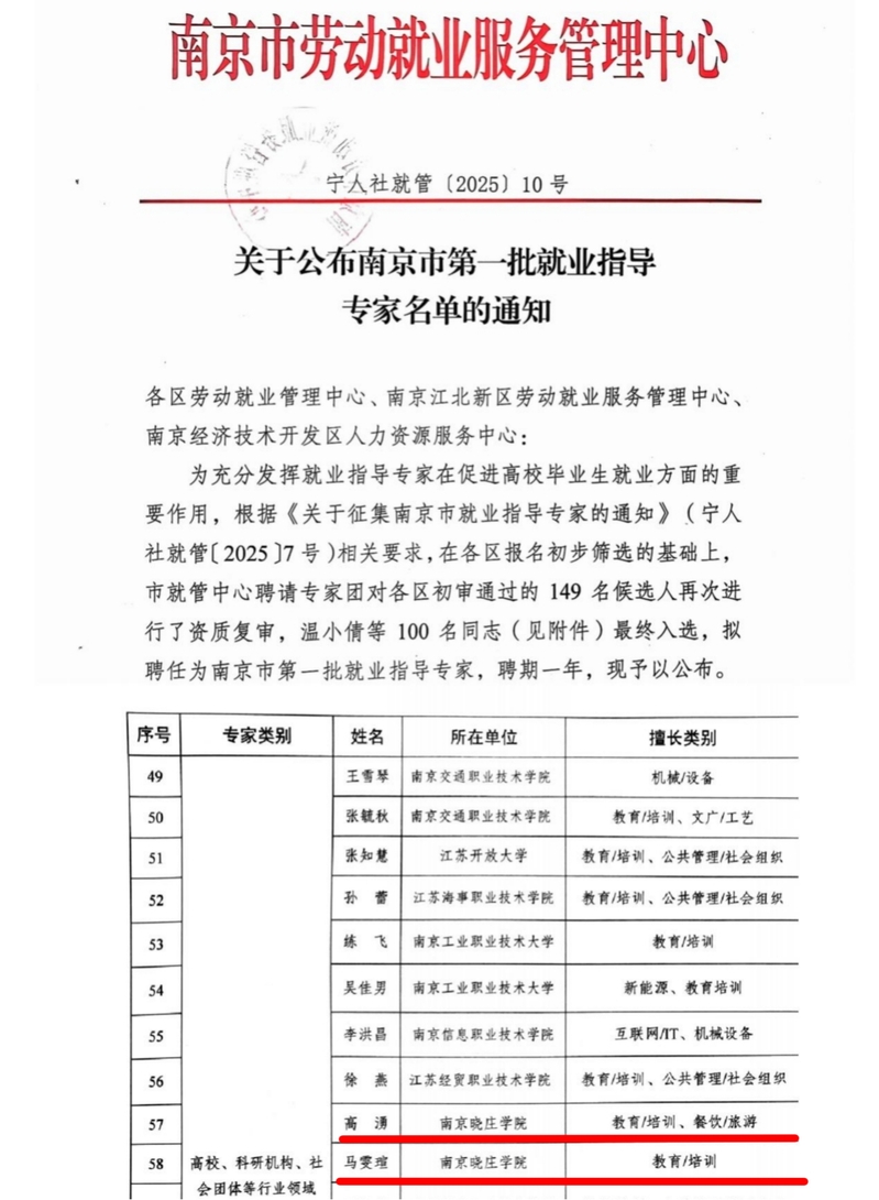 近日,南京市劳动就业服务管理中心公布《南京市第一批就业指导专家名单》(宁人社就管〔2025〕10号),我校马雯瑄、高湧两位教师凭借深厚的育人情怀和专业素养成功入选。