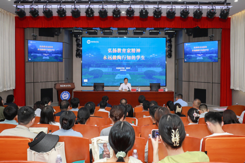 张策华以《弘扬教育家精神,永远做陶行知的学生》为题,为全体新教工讲授入职“第一课”。他紧密围绕教育家精神的内涵与赓续、陶行知教育思想精髓、陶行知教育家精神鲜明特征及陶行知教育家精神对教育改革与教师成长启示四个核心维度,强调新时代教育工作者要以陶行知教育思想为指引,自觉践行教育家精神,传承“爱满天下”的博大教育情怀,在实践中不断涵养高尚师德师风,在教学中持续精研、锐意创新,在学术上勇毅探索、力攀高峰,早日成长为高素质专业化教师队伍中的骨干力量。