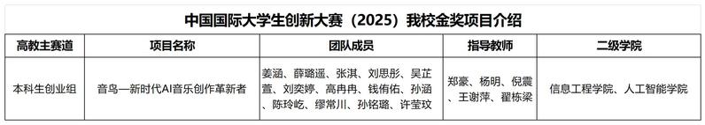 10月12日—15日,中国国际大学生创新大赛(2025)在郑州大学举办,来自世界各地的青年学子以线上线下相结合的方式共襄创新盛举。我校信息工程学院参赛项目《音鸟-新时代AI音乐创作革新者》(指导老师:郑豪、杨明、倪震、王谢萍、翟栋梁)先后经过校决赛、省赛网评、省决赛、省排位赛、国赛网评、总决赛等环节,一路过关斩将,一举斩获高教主赛道金奖,成功实现我校在该赛事中全国总决赛金奖“零”的突破,创造了历史最好成绩。