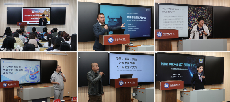 活动举办了“共话AI时代的艺术教育变革”专题系列讲座。讲座特别邀请了南京艺术学院副校长李彤教授,南京艺术学院元宇宙艺术与设计研究院负责人盛瑨教授,东南大学艺术学院李轶南教授,南京市栖霞区燕小集团副校长张静教授,视网么信息科技有限公司总经理张帅,以及南京晓庄学院美术学院教师许炎骏六位专家作专题分享,他们围绕人工智能艺术实践、非遗数字化创新、数字教育平台应用及元宇宙艺术产业展开系统分享与深入探讨,内容涉及艺术学学科建设的顶层规划、科研组织架构、文化传承与国际传播;AI在非遗设计、AR/VR创作、数字教育培训及智能工具应用等领域的实践探索;AI技术对艺术教育转型、创意能力培育和社会适应力提升的促进作用。六场报告通过理论阐释与实践案例相结合的方式,共同展现了AI时代艺术教育与产业发展的全景视野,为高校艺术教育在数字化、智能化浪潮下的创新发展提供了有益借鉴。