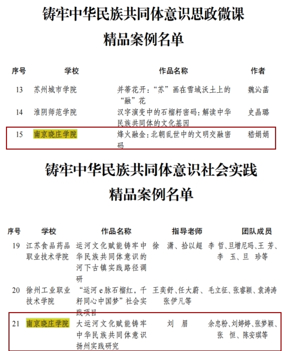 近日,由江苏省民族宗教事务委员会、江苏省委宣传部、江苏省委统战部和江苏省教育厅共同主办的江苏省第三届“铸牢中华民族共同体意识·高校在行动”系列活动精品案例评选结果公布。我校马克思主义学院《烽火融金:北朝乱世中的文明交融密码》入选铸牢中华民族共同体意识思政微课精品案例,商学院《大运河文化赋能铸牢中华民族共同体意识扬州实践研究》入选铸牢中华民族共同体意识社会实践精品案例。此前,我校美术学院报送的3件作品入选“铸牢中华民族共同体意识·高校在行动”中华优秀传统文化非遗作品展陈。