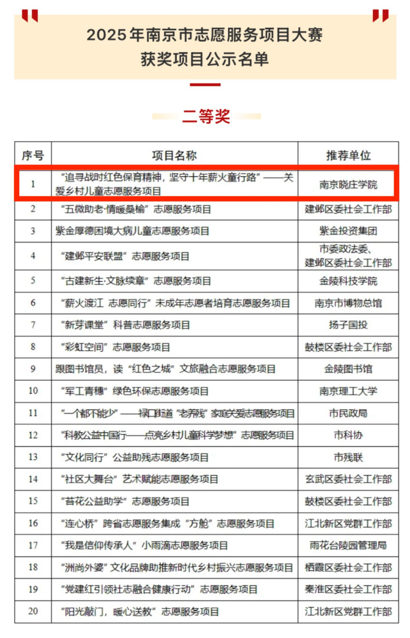 近日,由南京市委社会工作部主办的2025年度南京市志愿服务项目大赛顺利落幕。我校幼儿师范学院《“追寻战时红色保育精神,坚守十年薪火童行路”——关爱乡村儿童志愿服务项目》经申报推荐、资格审核、线上初评和现场路演等多轮环节,在全市166个参赛项目中脱颖而出,荣获大赛二等奖。