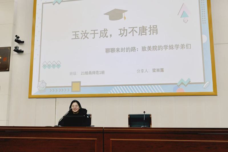 分享会上,目前就读于南京艺术学院艺术史专业的梁雨露、南京艺术学院视觉传达与系统设计专业的李慧敏、沈阳师范大学戏曲与曲艺专业的邹琴以及山东艺术学院艺术学专业的薛雯心四位成功考研上岸的优秀校友依次登台,结合自身备考经历分享干货。他们围绕院校专业选择、备考时间规划、公共课与专业课复习、复试准备及心态调节等核心内容,结合美术学院专业特色,重点讲解了理论课程学习方法、快题设计技巧与作品集准备要点,强调了英语积累、政治时政学习及专业课真题梳理的重要性,为学弟学妹提供了可落地的复习策略。