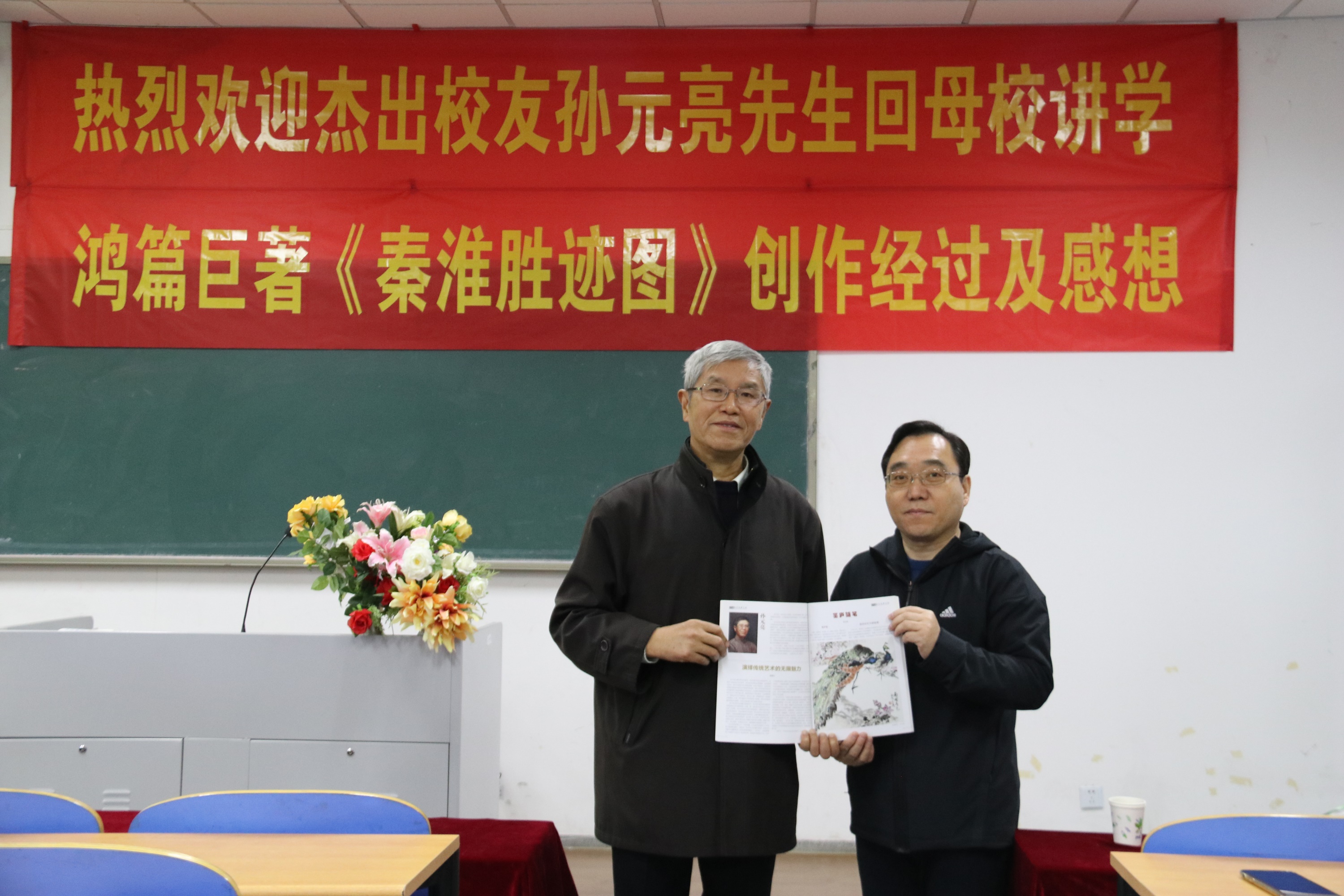 11月26日下午,美术学院杰出校友孙元亮先生回母校讲学,贾创雄副校长和校友办李震主任亲自接见。孙先生此次返校给美院学子带来了“我是怎样创作《秦淮胜迹图》的”专题讲座,美术学院党总支书记陈瑶主持了本次活动。